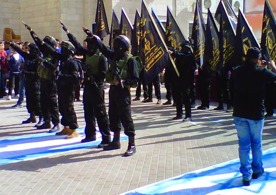 I’ll begin with a simple illustration. The above photograph is of a student rally held last November at Al-Quds University, a mainstream Palestinian institution in East Jerusalem. The rally, in support of the armed fundamentalist group Islamic Jihad, featured actors playing dead Israeli soldiers and a row of masked men whose stiff-armed salute was returned by some of the hundreds of students in attendance. Similar rallies have been held periodically at the school.
