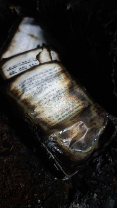 According to Karmei Tzur residents, the suspected arsonists piled up the Torah scrolls and set them alight.