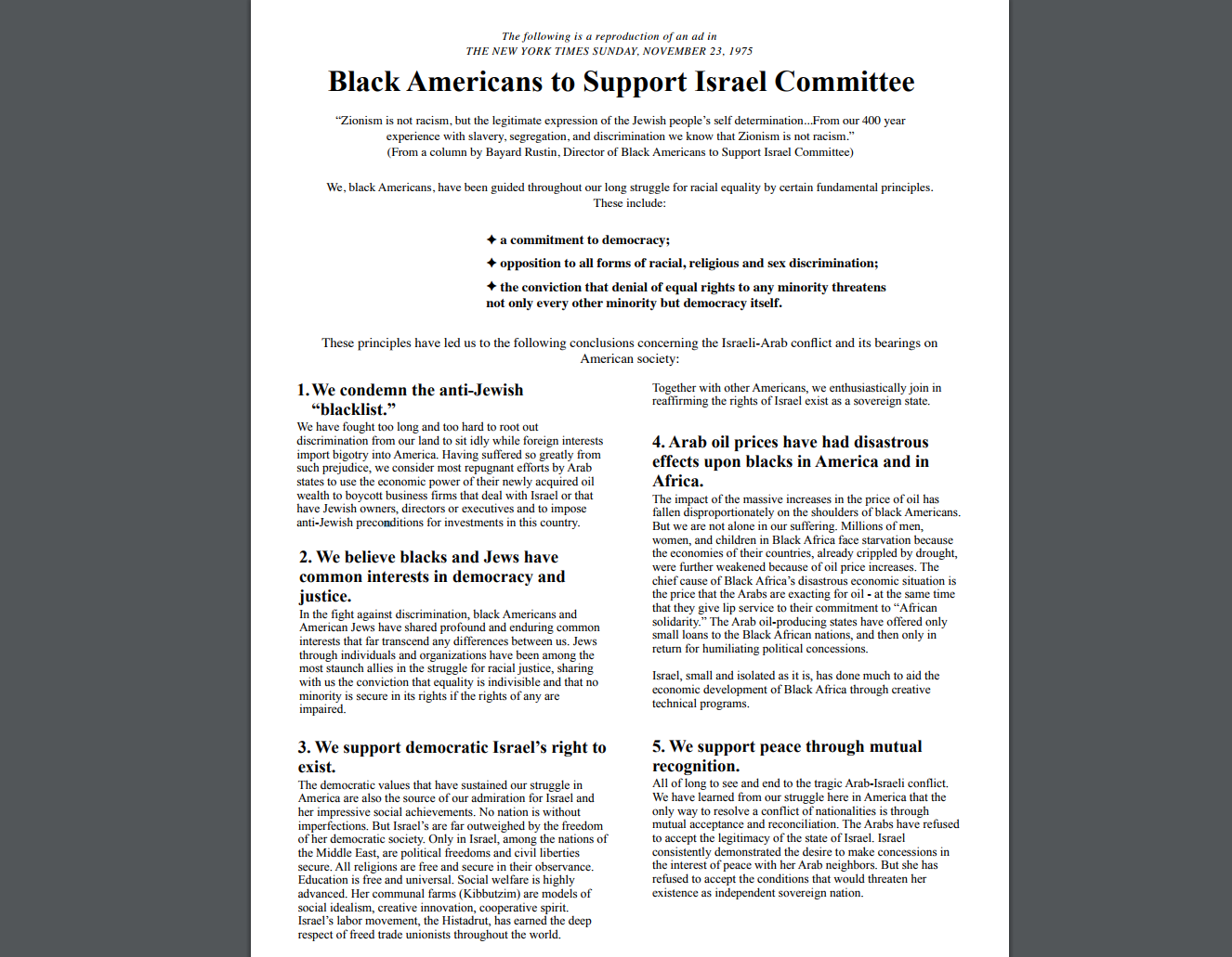 In 1975, Parks - along with other prominent African-Americans - signed a full page ad in the New York Times that was explicitly against the Arab economic boycott of Israel.