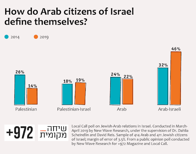 This means that a vast majority of Israeli Arabs 65% - identify with the term "Israeli" and the number who identify as Palestinian only has been cut by nearly half in five years, from 26% to 14%.