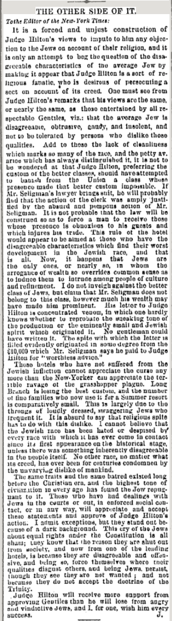 A Jew named Joseph Seligman and his family were refused lodging at the Grand Union Hotel in Saratoga, upstate New York because they were Jewish, even though they had stayed there previous years. The owner of the hotel, Judge Henry Hilton (not related to the Hilton hotel chain of today), justified this because, he said, his gentile guests objected to being with Jews.