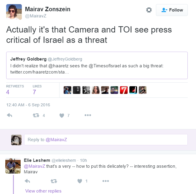 A subthread opened up from Mairav Zonszein, who styles herself as a journalist and has published in The Guardian, the New York Times, the Forward and elsewhere: