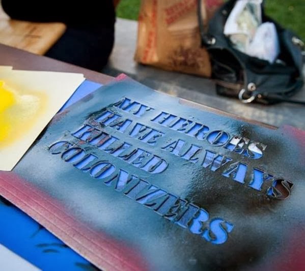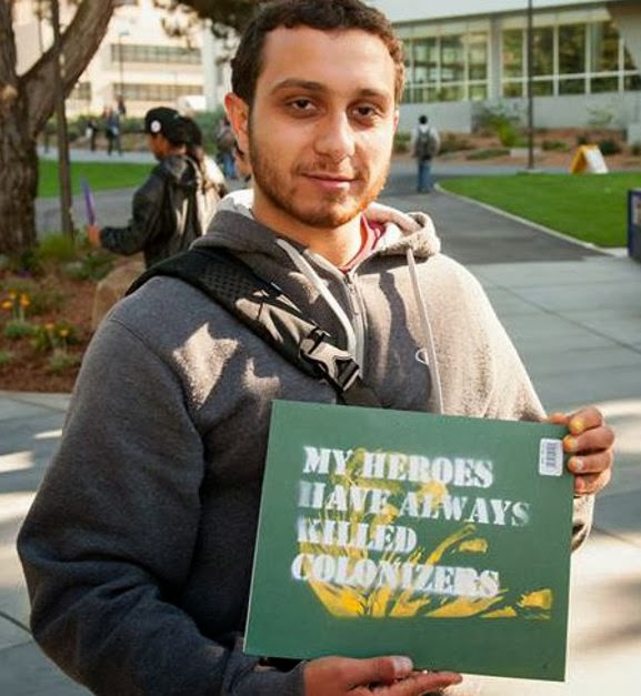 On November 7, 2013 members of the campus community gathered to celebrate the sixth anniversary of the installation of a mural honoring Edward Said. Nearby, several student organizations were staffing tables to raise awareness of their groups' activities. One table was set up to allow passers-by to create their own placards with a pre-made stencil, which read, “My heroes have always killed colonizers.”