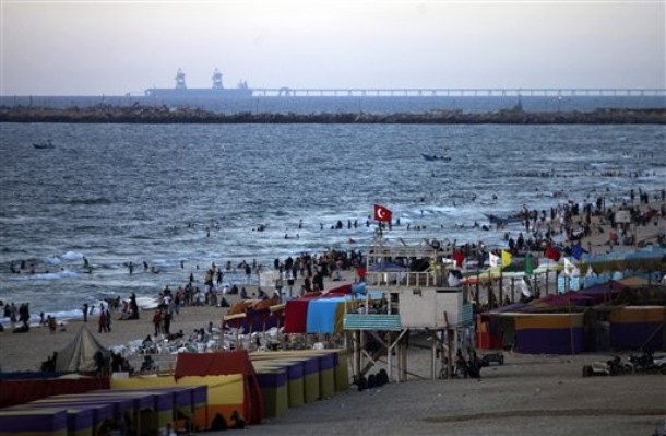 A Turkish flag flies on a mast, as Palestinians enjoy the beach in Gaza City, Sunday, June 6, 2010