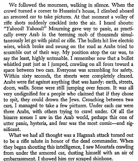Similar anecdotes about Arabs in 1948 abound. Here is one right after the Arabs captured Castel, but at the cost of losing their commander, Abdel Kader Husseini: