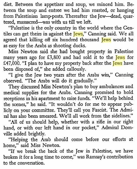 In 1948, he pretended to be an Arab fighter and observed Israel's War of Independence - from the Arab side. His observations were published in 1951 as "Cairo to Damascus." You can read most of the book online here, and it is fascinating. For example, he writes about dinner with London anti-semite, Nazi admirer and Arab supporter Robert Gordon-Canning: