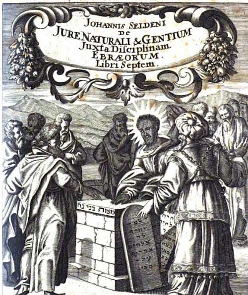 Here is the frontispiece for "The Law of Nature," or more accurately, "De jure naturali et gentium, juxta disciplinam Ebræorum," showing the Noahide laws being taught to the world (the lectern is labeled "Laws of the Sons of Noah" in Hebrew):