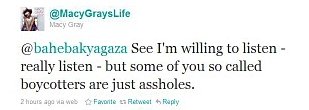 UPDATE 2: After the BDSers started attacking her for her decision, she wrote a classic tweet that says what I was saying, in a somewhat blunter manner (h/t CHA again):