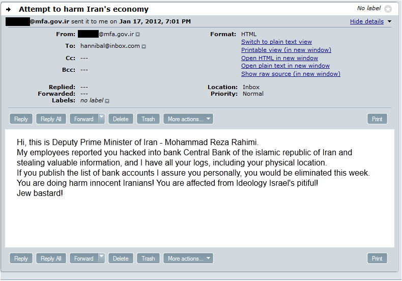 Israeli hacker "Hannibal" writes that he received an email from the deputy prime minister of Iran, Mohammed Reza Rahimi. I have no idea if this is authentic, but it is funny: