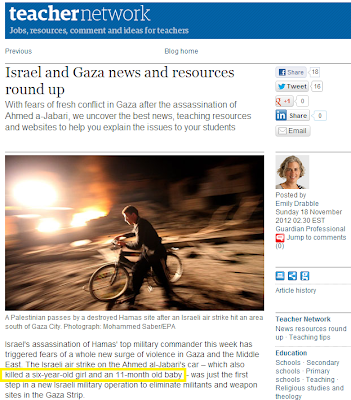 Israel's assassination of Hamas' top military commander this week has triggered fears of a whole new surge of violence in Gaza and the Middle East. The Israeli air strike on the Ahmed al-Jabari's car – which also killed a six-year-old girl and an 11-month old baby – was just the first step in a new Israeli military operation to eliminate militants and weapon sites in the Gaza Strip.So, this is what UK teachers are telling their students?