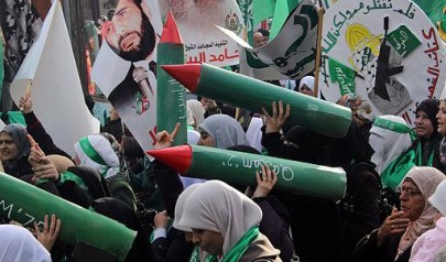 The rally included signs and speeches giving praise to rockets that were aimed at Israeli civilians and the Al Qassam Brigades terror group.