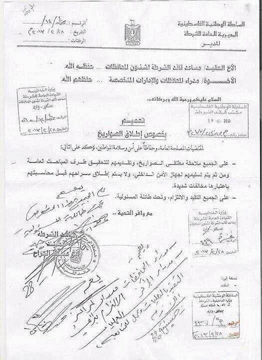 The directive called on all provincial managers, specialized departments and police stations to pursue rocket launchers and bring them to Hamas officials and then be handed over to the Internal Security Agency where they will be held accountable for a severe violation of the law.