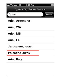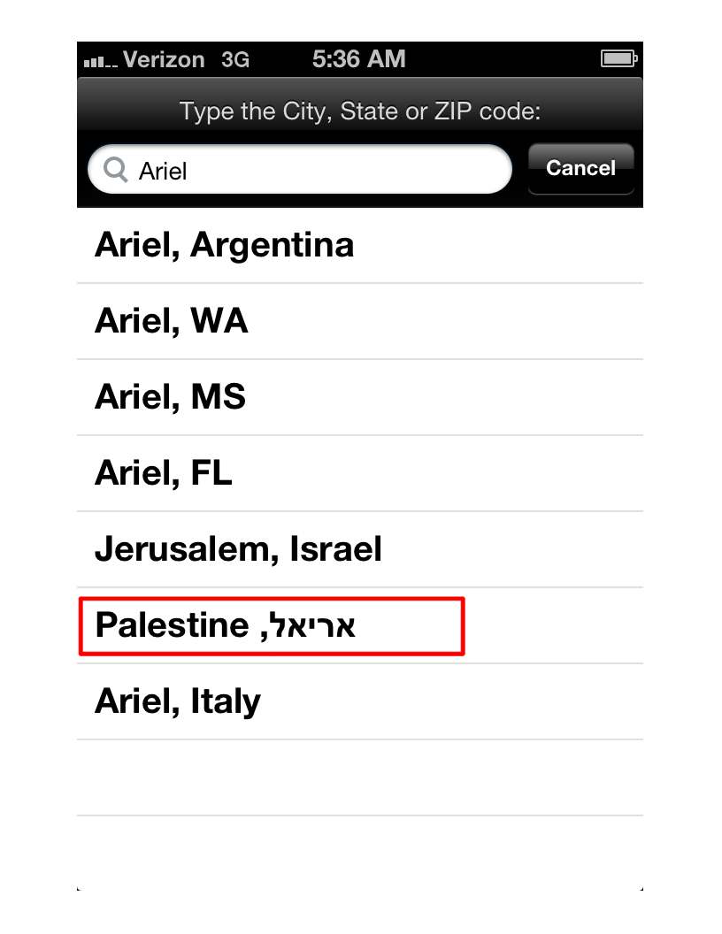 Interestingly, Yahoo Weather is powered by The Weather Channel - but that website puts Ariel in Israel: