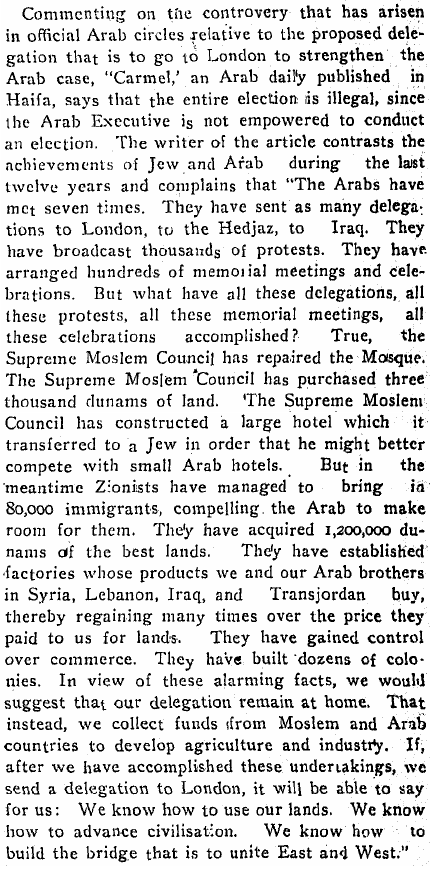 ...The writer of the article contrasts the achievements of Jew and Arab during the last twelve years and complains that "'The Arabs have met seven times. They have sent as many delegations to London, to the Hedjaz, to Iraq. They have broadcast thousands of protests. They have arranged hundreds of memorial meetings and celebrations. But what have all these delegations, all these protests. all these memorial meetings, all these celebrations accomplished?. True, the Supreme Moslem Council has repaired the Mosque. The Supreme Moslem Council has purchased three thousand dunams of land. 'The Supreme Moslem Council has constructed a large hotel which it transferred to a Jew in order that he might better compete with small Arab hotels.. But in the meantime Zionists have managed to bring in 80,000 immigrants, compelling. the Arab to make room for them. They have acquired 1,200,000 dunams of the best lands. They have established .factories whose products we and our Arab brothers in Syria, Lebanon, Iraq, and Transjordan buy, thereby regaining many times over the price they paid to us for lands. They have gained control over commerce. They have built -dozens of colonies. In view of these alarming facts, we would suggest that our delegation remain at home. That instead, we collect funds from Moslem and Arab countries to develop agriculture and industry. If; after we have accomplished these undertakings, we send a delegation to London, it will be able to say for us: We know how to use our lands. We know how to advance civilisation. We know how to build the bridge that is to unite East and West"The same newspaper, a month earlier, describes a roughly translated Arab children's song: