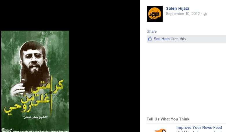 More recently Hijazi showed his admiration for Khader Adnan, a hero of Islamic Jihad: