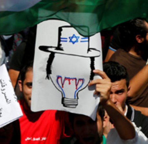 Notice the antisemitic poster in this photo of a lightbulb turned into a religious Jew with blood coming out of his fangs: