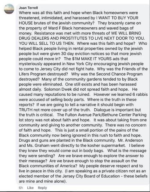 While the (Jewish) mayor of Jersey City condemned the statement, the Hudson County Democratic Black Caucus - while pretending to want dialogue with the Jewish community - ended up agreeing with the content - not the tone - of Terrell-Paige. This wasn't the drunken ramblings of an individual but an official press release: