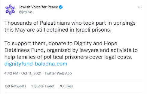 Jewish Voice for Peace tweeted, "Thousands of Palestinians who took part in uprisings this May are still detained in Israeli prisons." It then gave a link to a fund that pays Palestinian terrorists.