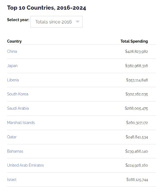 And here's another chart from OpenSecrets showing how much various nations themselves have spent to influence Washington over the past eight years. Israel is in tenth place, while others like China and Saudi Arabia have spent hundreds of millions.