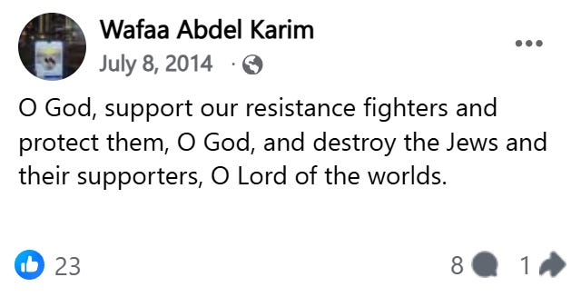 And while Shadi keeps his own social media presence relatively sanitized, his wife, Wafaa Abdel Karim, is less discreet. She openly flaunts her admiration for Hamas and jihad. On Facebook, she posted “O Allah, grant victory to our fighters and protect them, O Allah. Destroy the Jews and their supporters, O Lord of the worlds.” She’s posted Hamas propaganda straight from the Qassam Brigades on multiple occasions.