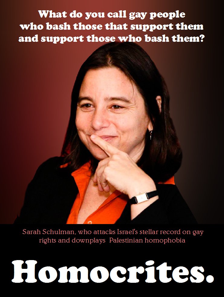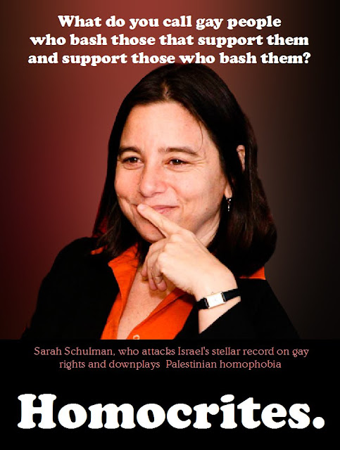 Simple. Sarah Schulman is not a gay-right activist. She is a hater of Israel, and she tries to shoe-horn her hatred of the Jewish state in to a gay-rights agenda. The fact that her positions are thoroughly inconsistent with any sane gay-rights agenda doesn't matter since, to haters like Schulman, consistency and gay rights are far less important than destroying the state that provides safe refuge to the people of her ancestral religion.