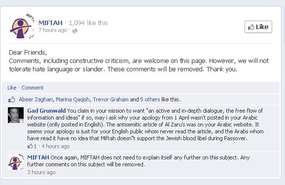 • Gad Grunwald You claim in your mission to want "an active and in-depth dialogue, the free flow of information and ideas" if so, may i ask why your apology from 1 April wasn't posted in your Arabic website (onlly posted in English). The antisemitic article of Al Zaru’s was on your Arabic website. It seems your apology is just for your English public whom never read the article, and the Arabs whom have read it have no idea that Miftah doesn''t support the Jewish blood libel during Passover.