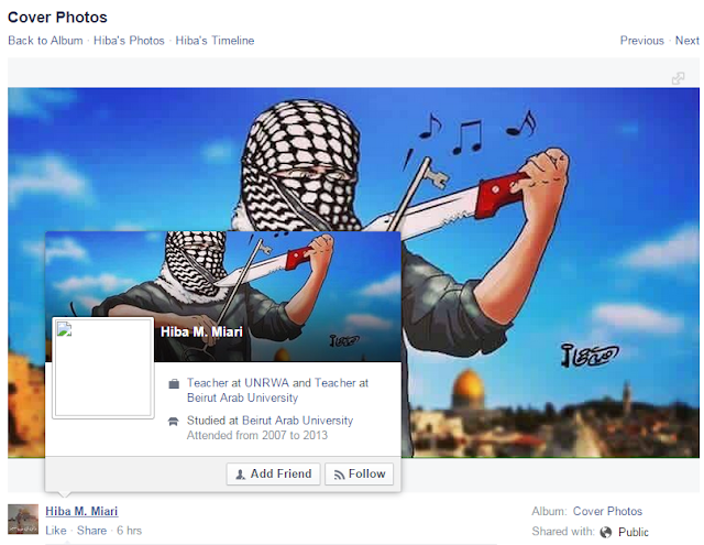 Yesterday I reported on two other apparent UNRWA employees, both teachers, who also chose romantic allusions to violence as their Facebook profiles pictures. By any sane measure, given UNRWA's stated neutrality aims, people who literally define themselves by violence - as seen by their choice of profile pictures on Facebook - must be fired. It is the cyberspace equivalent of a teacher in the US deciding to place a tattoo of a notorious violent gang on his or her face.