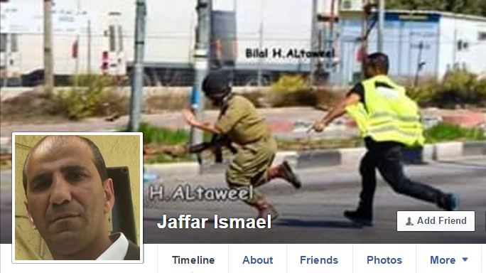 His current cover photo shows a knife-wielding Arab, pretending to be a journalist, chasing a soldier in Hebron seconds before he is shot dead. But the scene of an Israeli trying to save his own life is apparently worth the small price to pay of the attacker dying, in the twisted mind of Ismael.
