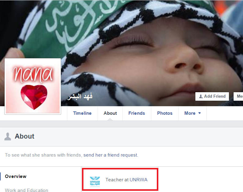 Someone with the nom de plume of "ÃlÄ…Ä… Türĸmąņ" on Facebook puts her job as "‎Ñø-ŧĥìñğ at UNRWA and ‎Teacher at ‎مدرسة بنات عسكر الاولى‎‎‎."