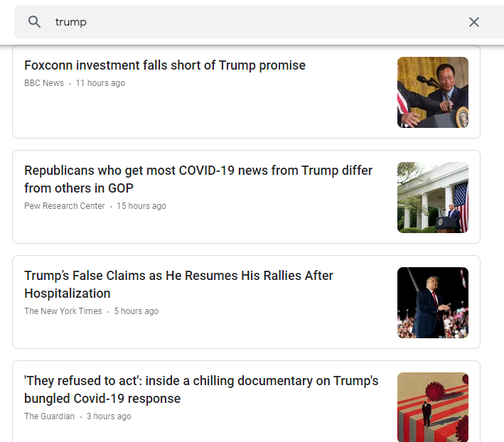 Here are the first seven results generated in a search I did for “Trump” on October 13, 2020, all negative: