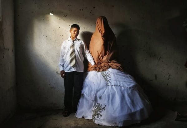 Young Palestinian groom Ahmed Soboh, 15 and his bride Tala, 14, stand inside Tala's house which was damaged during an Israeli strike in 2009, during their wedding party in the town of Beit Lahiya, near the border between Israeli and northern Gaza Strip September 24, 2013.