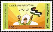 In 1991, Jordan commemorated the first intifada showing a hand throwing a rock - and a peace dove. Again, Israel is erased from the map.