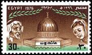 The 1976 and 1977 stamps made the religious theme a bit more explicit, as the stylized "refugees" stare at the Dome of the Rock: