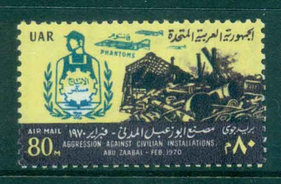This 1970 stamp commemorates the supposed bombing by Israel of a civilian metal factory in Abu Zabbaiin 1970.