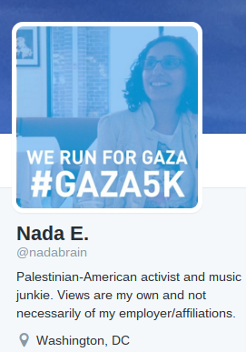 Nada does not mention UNRWA as her employer on Twitter, and she says that what she tweets are not the views of her unnamed employer.