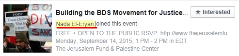 UPDATE: Bob Knot did his Facebook magic again on Nada El-Eryan. Check out all of these anti-Israel groups and events she supports: