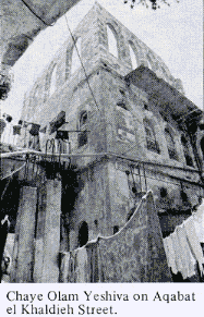Then you have another big yeshiva, Chaye Olam, with a Talmud Torah of twenty-two classrooms -- each classroom today is an Arab home. (A Talmud Torah consists of eight grades, and here there were three parallel classes.) Part of the building is now unused. That part was never finished because the Arabs brought a case against it in 1927 when the yeshiva wanted to start a new wing. They weren't able to finish it, so they just have the walls up. The yeshiva is close to what is the holiest part of Jerusalem for Jews.