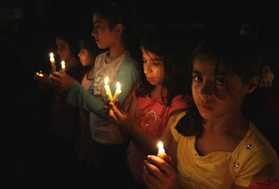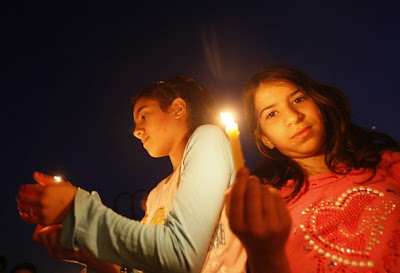 Palestinian girls hold candles during a march in protest against the lack of fuel to Gaza's power station, and the continued power outages in the city, on June 25, 2010 in Gaza City.