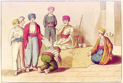 Al-Jazzar was, nonetheless, a violent and cruel individual whose title 'al-Jazzar' means 'The Butcher'. He would often find a pretext to lash out in savage assaults and harm Farhi and others. In fact, al-Jazzar had his adviser's eye plucked out, cut off the tip of his nose, and severed his left ear.[12] A famous illustration of those days shows al-Jazzar sitting in judgment in front of his Jewish adviser, who is wearing an eye patch.
