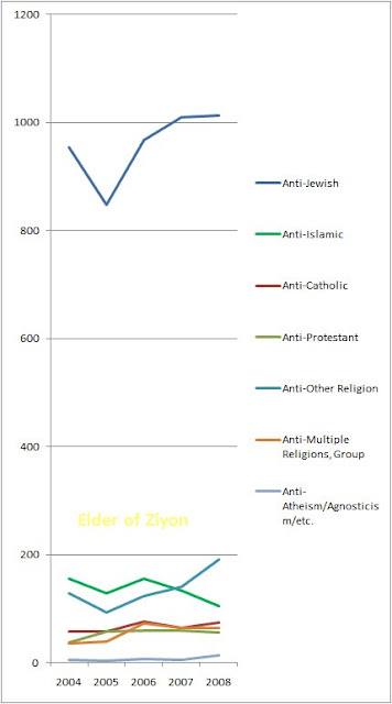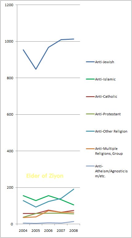 In New York State, the very spot where Islamic terrorists murdered nearly 3000 people, the number of anti-Islamic crimes were a mere six in 2008. The number of anti-semitic crimes? 129.