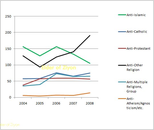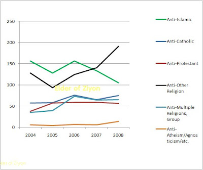 I went to the FBI hate crime page and pulled out the anti-religious hate crimes statistics for the years 2004-2008, the most recent ones published. It shows that anti-Islamic hate crimes were trending down:
