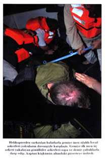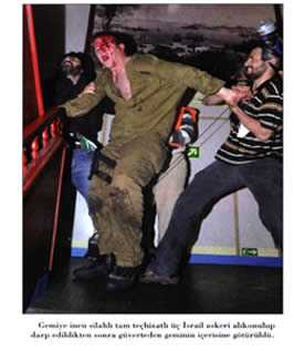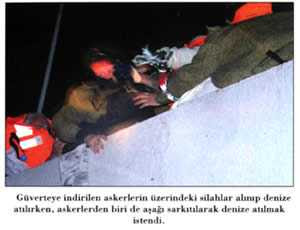 The operatives waiting on the upper deck put the captive soldiers on the floor. Those soldiers were beaten with iron bars and clubs; they were kicked and slapped. Some operatives attempted to throw the soldiers taken to the lower deck into the sea. A soldier hanging in the air during an attempt to throw him into the sea was rescued thanks to the intervention of other people, who prevented that from happening