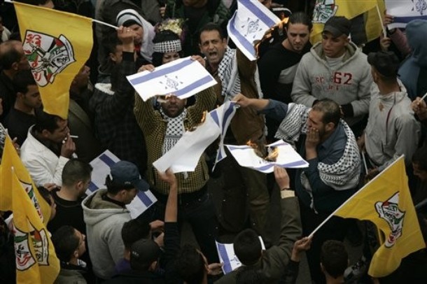 Palestinian Fatah supporters burn banners fashioned to look like Israeli flags, with an Al-Jazeera logo at their center instead of a Star of David, during a rally in the West Bank city of Ramallah, Tuesday, Jan. 25, 2011.