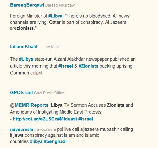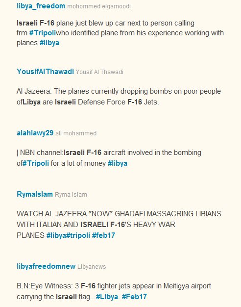Israeli F-16s! Jewish African mercenaries! Zionist riots! According to a bunch of tweeters, one or more callers to Al Jazeera claim to have seen Israeli F-16s land in Libya and/or bomb innocent civilians.