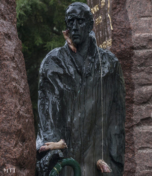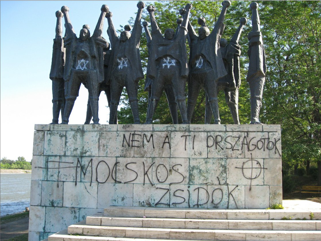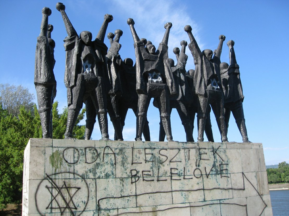 In the second, anti-semitic graffiti was scrawled on a statue commemorating the shooting of Jews into the Danube by the Arrow Cross militiamen towards the end of World War II (hundreds of Jews were lined up at the river's edge, told to take off their shoes, and shot so they fell into the river and were swept away.)