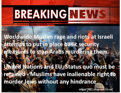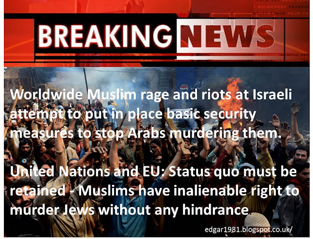 Palestinian Arabs and pretty much the whole Muslim world go insane, staging violent riots that include attempts to murder more policemen (which end in death for 3 rioters). The waqf that controls the Temple Mount orders Muslims to refuse to go through the detectors and to pray in the street outside.